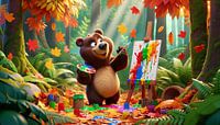 Midden op een herfstig verlichte open plek in het bos staat een gezellige beer, toegewijd aan het schilderen. Met een brutale glimlach en stralende ogen houdt hij een verfkwast in zijn poot en staat hij voor een schildersezel waarop zich een kleurrijk kleurenspel ontvouwt. De vloer is bezaaid met kleurrijke bladeren die eruit zien als confetti en het palet van herfsttinten weerspiegelen. Open verfpotten en verspreide kwasten getuigen van een creatief proces dat de schoonheid van het bos in een explosie van kleur vangt. Lichtstralen breken door het bladerdak en toveren een warm, gouden licht tevoorschijn dat de scène omhult in een sfeer van inspiratie en gezelligheid.