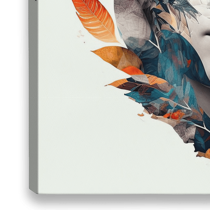 Deze kunst collage bestaat uit een vrouwen gezicht omringd door herfstbladeren en andere natuurelementen. De achtergrond is wit en de kleuren van de collage zijn die van de herfst, met een dominantie van oranje, blauw en bruin grijs. De collage heeft een vierkant…
