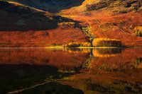 Herfst in het Lake District. De herfstkleurige lariksen en heuvels worden weerspiegeld in een meer.