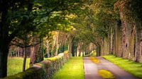 Een mooie steeg met oude bomen en een stenen muur in oktober