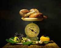 Warm , mooi aangelicht stilleven met herfst gevoel ,oude antieke weegschaal met diverse brood soorten ,cheddar kaas, blauwe en witte druiven , knoflook en druivenblad .