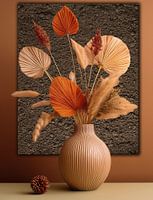 Dit kunstwerk toont een elegant bloemstuk in warme herfsttinten, gepresenteerd in een geribbelde vaas met een zachte, matte afwerking. De compositie bestaat uit gedroogde bladeren en pluimen in schakeringen van koper, roestbruin, beige en goudgeel. De bladeren zijn waaiervormig en gestructureerd, wat een harmonieuze balans biedt tussen vorm en textuur. De achtergrond versterkt de aardse uitstraling met een korrelige, zandkleurige structuur die perfect aansluit bij het natuurlijke kleurenpalet. Het geheel ademt een serene en verfijnde sfeer uit, met een moderne interpretatie van de herfst als inspiratiebron.