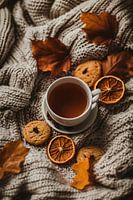 Verwarmende verwennerij in herfstsfeer: een dampende kop thee troont tussen knapperige koekjes en gedroogde sinaasappels, omlijst door helderbruine bladeren. De gezellige, gebreide achtergrond nodigt je uit om volop te genieten van de rust van het seizoen. Een harmonieus samenspel van smaken en texturen dat de zintuigen betovert.