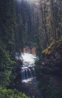 Mooie waterval begrensd door mistige geheimzinnige dennenbossen in Banff National Park.