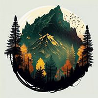 Dit fascinerende digitale schilderij toont een adembenemend berglandschap in een cirkelvormig kader van torenhoge, altijd groene bomen. De bergtoppen rijzen dramatisch omhoog, hun grillige hellingen baden in zacht, gouden licht dat doet denken aan de warmte van een herfstzonsondergang. Het gebladerte vertoont een adembenemende overgang…