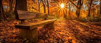 Een gouden zonnestraal breekt door het feloranje bladerdak en baadt een verlaten bankje in warm licht. De zachte rust van het herfstbos nodigt je uit om te vertoeven en te dromen. Deze foto geeft een ontspannen sfeer aan elke woonkamer en brengt de natuur direct in de leefruimte.