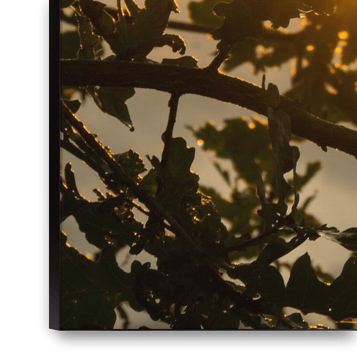 Koop dit landschapskunstwerk Herfst zonsondergang met warm oranje licht achter groene bladeren van adventure-photos als print op canvas, aluminium dibond, (ingelijste) fotoprint, behang en ArtFrame. Voor jou op maat geprint in Fine-Art kwaliteit.