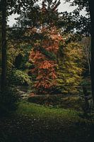 Een sfeervol herfsttafereel met kleurrijke bomen die weerspiegelen in het stille water, omringd door rust en natuur.
