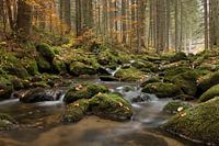 Beekje tijdens de herfst in het bos, met groene stenen in de stoom