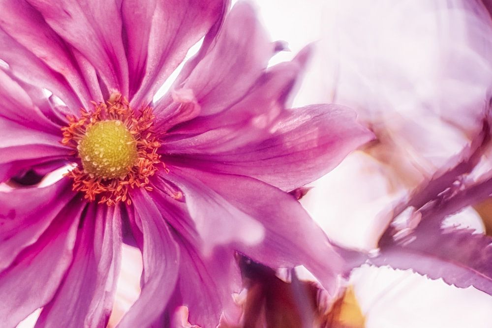 Macrofotografie van een roze herfstanemoonbloem. De combinatie van zonneschijn en tegenlicht verandert de achtergrond in iets magisch.
