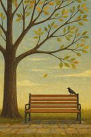 Dit poëtische kunstwerk legt een rustig herfstmoment vast in een serene parkomgeving. Een houten bankje staat leeg onder een hoge boom waarvan de goudgroene bladeren beginnen te vallen. Een eenzame kraai zit op de rand van het bankje en voegt een gevoel van eenzaamheid en stilte toe. De lucht straalt in zachte blauwe en gele tinten en…
