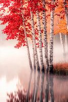 Slanke, zilveren berkenbomen met helderrode en gouden bladeren rijzen op te midden van zachte mist, en vieren de herfst in al zijn glorie. De weerspiegeling in het kalme water versterkt de harmonieuze verscheidenheid aan kleuren en nodigt uit tot rust en contemplatie. Ideaal voor de woon- of slaapkamer om een vredige sfeer te creëren.