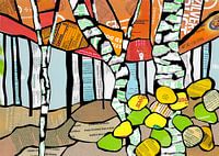 collage van stukken verpakking samengesteld alsof het een mozaiek betrof in de geabstraheerde voorstelling van een bos met drie berken in de voorgrond. Van dichtbij of bij sterke vergroting nodigen de teksten uit tot herleiden van het product waar de verpakking vandaan komt. met enige afstand, of bij klein formaat worden de teksten…