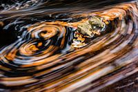 In de Belgische Ardennen in de La Hoëgne rivier, zag ik deze herfstbladeren om deze rotsblok heen draaien. Het is een mooie tegenstelling van rust en dynamiek.