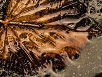 Een middag in het park. Het waait en regent en putjes in het pad hebben zich gevuld met regenwater. In die natte putjes drijven bladeren. Dat geeft hun gehavende huidje een gave glans.