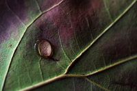 Een groen herfstblad dat aan het verkleuren is naar paars en rood. De nerven zijn duidelijk zichtbaar. Op het blad licht een waterdruppel die de structuur van het blad als een vergrootglas uitvergroot.