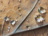 Een macro opname van een herfstblad met waterdruppels. De bladnerven zijn mooi zichtbaar en de waterdruppels reflecteren allerlei omgevingskleuren.