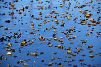 Een dun laagje ijs met het laatste blad dat van de bomen valt in de maand december.