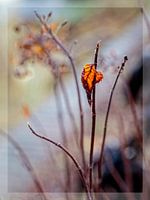 Een verdroogd en verkleurd rood-bruin blad aan deze struik is de stille getuige van voortgeschreden herfst op een ochtend met gedempt licht.