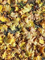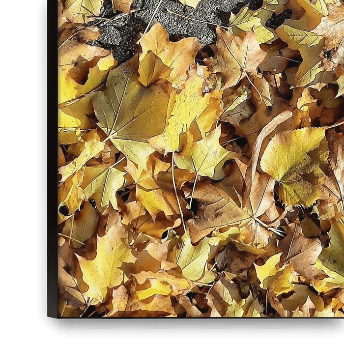 Een tapijt van gouden bladeren, prachtige herfstkleur die kraakt als je erop loopt. Het is een heel mengsel van bladeren, voornamelijk esdoorn. Louter glorieuze kleuren.