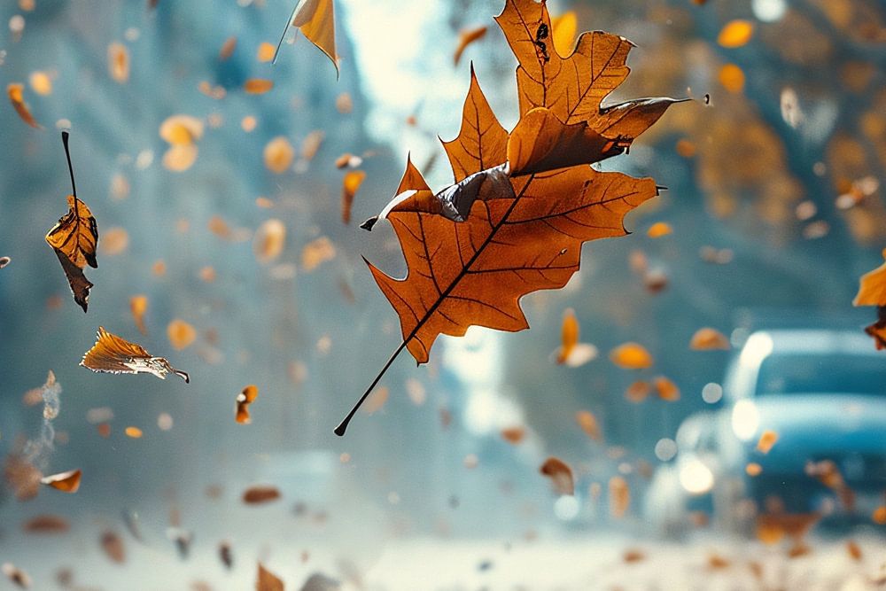 Breng de herfst binnen met deze prachtige foto van vallende bladeren in een stadsstraat. Perfect voor een sfeervolle touch in je woonkamer of slaapkamer.