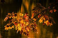 Tak met kleurrijke herfstbladeren van esdoorn boven een meer