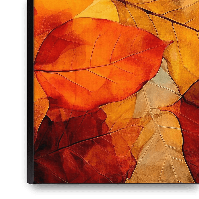 Compositie van herfstbladeren in een warme kleurstelling van rood, geel, oranje, bruin en zwart. Mooi gedetailleerd weergegeven in een nonchalante compositie. Passend bij diverse stijlen en trends.