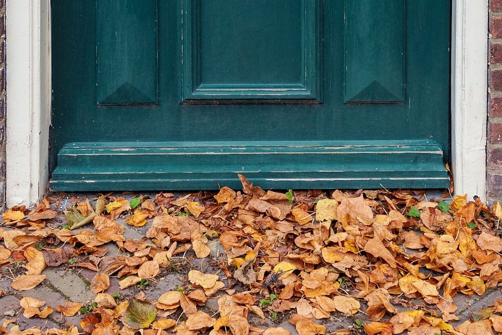 Groene houten voordeur van een bakstenen huis, met een hoop gevallen herfstbladeren op de stoep ervoor.