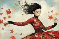 Herfstbladeren - Dit vrouwen schilderij toont een jonge Aziatische vrouw in een rood met gouden traditionele jurk, zwevend tussen vallende bladeren tegen een zachtgekleurde achtergrond.