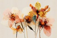 Een delicaat aquarelschilderij van abstracte bloemen in warme, aardse tinten van amber, sienna en goud. De zachte penseelstreken en doorschijnende bloemblaadjes roepen een gevoel op van een zachte herfstbries en stille elegantie.