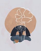 Abstract-minimalistisch landschap met twee bloemen in de avondzon in de herfst. Het landschap bestaat uit een aantal organische vormen die staan voor planten, een meertje, een brug en de zon.