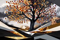 Dit moderne ontwerp toont een levendige boom in herfstkleuren, waarbij de bladeren in rijke tinten van goud, oranje en rood de boventoon voeren. De achtergrond heeft een abstracte compositie met geometrische vormen en contrasterende lijnen, die de aandacht trekken en een gevoel van beweging geven. Het kunstwerk combineert natuur en abstractie op een unieke manier, waarbij de zwarte silhouet van de boom stevig afsteekt tegen de dynamische omgeving. Deze compositie past perfect in een moderne inrichting, zoals een kantoor of woonkamer, en brengt een gevoel van herfst en transformatie in elke ruimte.