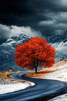 Te midden van grijze wolken en besneeuwde bergen schittert een felrode boom als een levend schilderij van de natuur. De gebogen weg nodigt uit tot een zielswandeling, terwijl het samenspel van kleuren en texturen harmonie en rust uitstraalt. Ideaal voor de woonkamer, waar het een uitnodigende en inspirerende sfeer creëert.