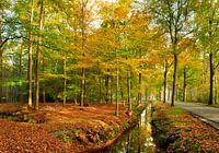 De weg naar de Lage Vuursche is schitterend. Hij loopt door een beukenbos. Langs de weg is een sloot waarin de bomen in herfsttooi worden weerspiegeld.