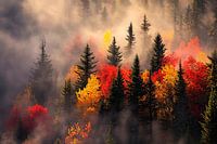 Een betoverend kleurenspel ontvouwt zich in de dichte mist, waar helder goud en vurig rood harmonieus samensmelten met diepgroen. Dit levendige boslandschap vangt de essentie van de herfst en brengt rust in elke kamer. Perfect voor de woonkamer, het creëert een uitnodigende en inspirerende sfeer.