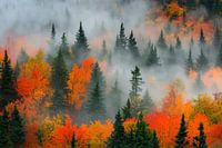 Dompel jezelf onder in de magische wereld van een mistig bos waar feloranje en vurig rood samenkomen met diepgroen. De mystieke sfeer ontvouwt zich tussen hoge dennenbomen, alsof het bos geheimen herbergt. Ideaal voor de woonkamer om een uitnodigende, rustgevende sfeer te creëren en het hart van elke natuurliefhebber te verrukken.