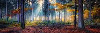 Een panorama beeld van een herfstbos in het zonlicht, zonnestralen geven de herfstbladeren net even meer herfstkleuren.