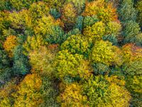 Herfstbos met kleurrijke bladeren van bovenaf gezien tijdens een mooie herfstdag. De bladeren aan de bomen veranderen van kleur in dit bos. Het dichte bladerdak van de bomen in het bos lijkt een lappendeken van kleurrijke bladeren.