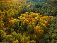 Herfstbos met kleurrijke bladeren van bovenaf gezien tijdens een mooie herfstdag. De bladeren aan de bomen veranderen van kleur in dit bos in Gelderland, Nederland.
