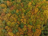 Bovenaanzicht van een bos met herfstkleuren in natuurgebied de Veluwe.