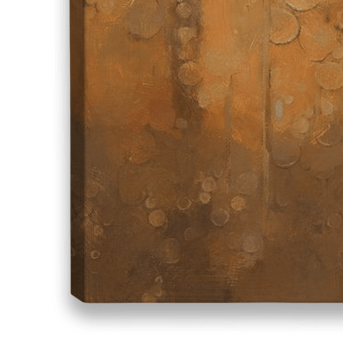 Dit werk toont een dichte verzameling bomen in een herfstbos, badend in warme tinten van goud en bruin. De bladeren zijn weergegeven als talrijke cirkels die een betoverend spel van licht en schaduw creëren. De verticale lijnen van de bomen contrasteren prachtig met de ronde vormen van de bladeren, waardoor een dynamisch en toch…
