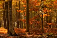 Bos in warme rode/oranje herfstkleuren met zacht zonlicht schijnend door de takken met bladeren.