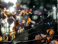 Een herfstbos in de winter met zon en druppels water glinsterend in het licht.