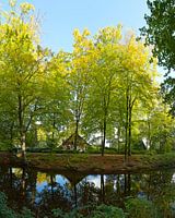 herfst, bos, boerderij, bomen, water, spiegeling, reflectie, geel, bruin,