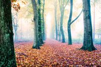 De combinatie van herfstkleuren, de opkomende zon en mist geven deze foto een mysterieuze en sprookjesachtige sfeer.