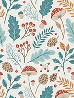 Deze illustratie is een prachtig en ingewikkeld patroon van boselementen, perfect om het gezellige gevoel van de herfst binnenshuis te brengen. Het ontwerp bestaat uit een charmante mix van grillige paddenstoelen, dennenappels en verschillende soorten gebladerte in een rustiek, aards kleurenpalet. De handgetekende stijl geeft het kunstwerk een warme, organische uitstraling, waardoor het een ideale keuze is voor een breed scala aan producten, van woningdecoratie en textiel tot briefpapier en kleding. Dit betoverende ontwerp geeft de essentie weer van een vredige wandeling door het bos op een frisse herfstdag.