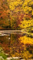 In het Landgoed Clingendael (Den Haag) is deze afbeelding gemaakt van de intense herfstkleuren. Waar de meeste mensen vooral naar paddenstoelen zoeken kijkt bijna niemand nog naar de omgeving waar ze in staan. De rood en geel tinten van de bomen reflecteren in het stilstaande water. Intenser kan het niet, maar toch straalt dit beeld vooral rust uit.