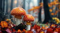 Deze foto toont een close-up van rode paddenstoelen met witte stippen bedekt met herfstbladeren op de bosbodem. De felle kleuren van de paddenstoelen contrasteren sterk met de warme tinten van de herfstbladeren. De scène doet denken aan een sprookje uit het bos en brengt een magische sfeer over. De gedetailleerde patronen van de paddenstoelen en de textuur van de bladeren voegen een extra dimensie van schoonheid en complexiteit toe. De rode paddenstoelen staan centraal en trekken de kijker mee in de fascinerende wereld van het herfstbos. Dit beeld nodigt de kijker uit om betoverd te worden door de magie en het mysterie van het bos.