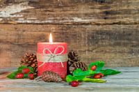 De samenstelling van de herfst met brandende kaarsvlam, pijnboomkegels, rode roze bottelsvruchten en bladeren op houten lijst met houten achtergrond, Kerstmiskaart, Kerstmisornamenten, Kerstmisdecoratie, groetkaart, Kerstmislicht