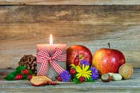 Herfstcompositie met kaars, voedsel en bloemen op houten lijst van Alex Winter